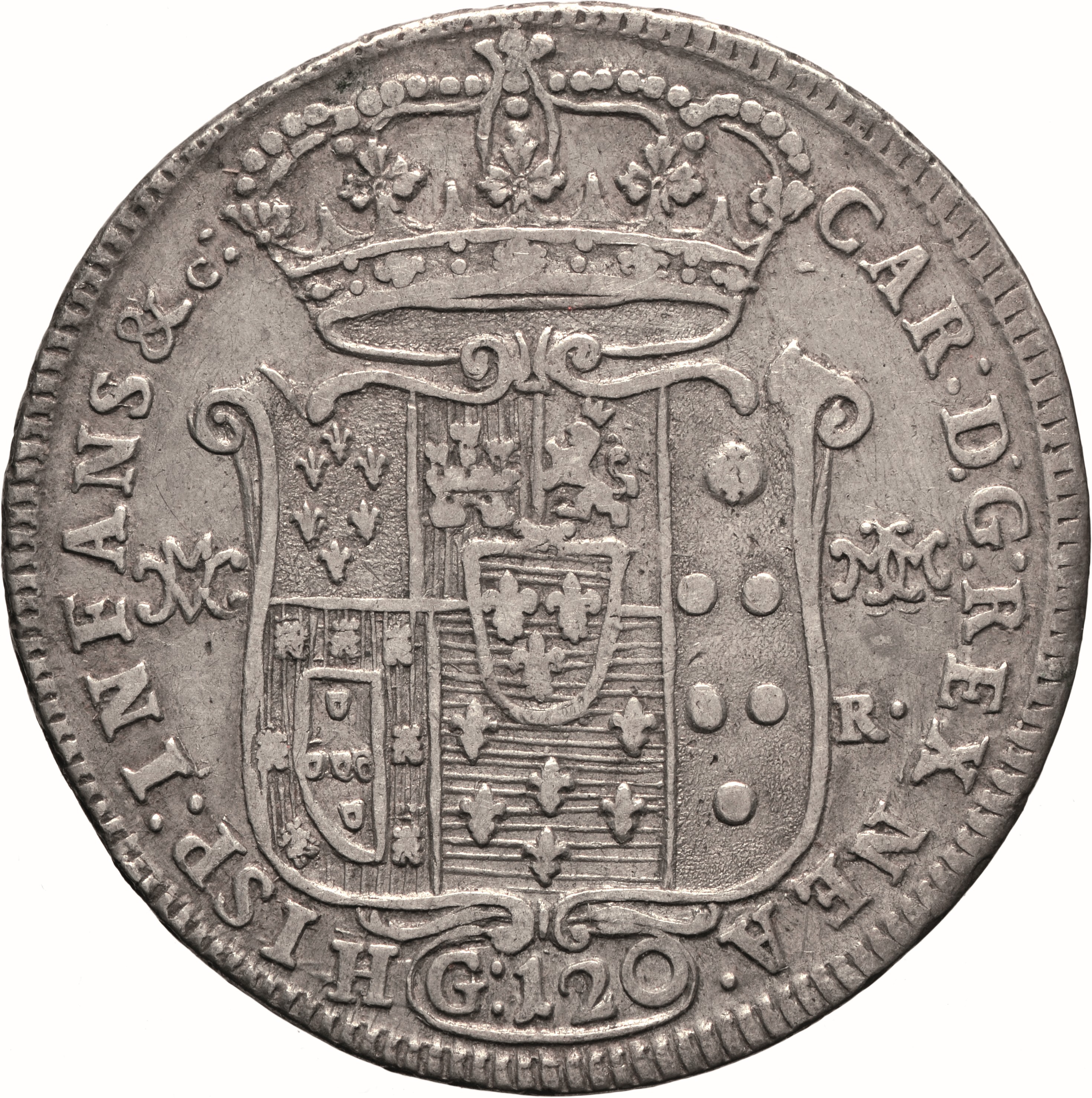 Dritto: Il Sebeto sdraiato sulla riva del mare, con braccio destro adagiato su di un’urna da cui scorre acqua e nella mano sinistra un badile; dietro, un pino, e sullo sfondo, il Vesuvio. In esergo, D’ 1749 G:. Campo monetale delimitato da filetto dentellato. Rovescio: Scudo coronato in cartella, troncato: nel 1°, interzato in palo di Farnese, Castiglia e León; nel 2°, partito di Portogallo e Angiò; sinistrato di Medici. Sul tutto, nel centro, scudetto dei Borbone. Ai lati V͜ M / M͜ M; in basso a d., R·; sotto, in cartella, G: 120. Campo monetale delimitato da filetto dentellato