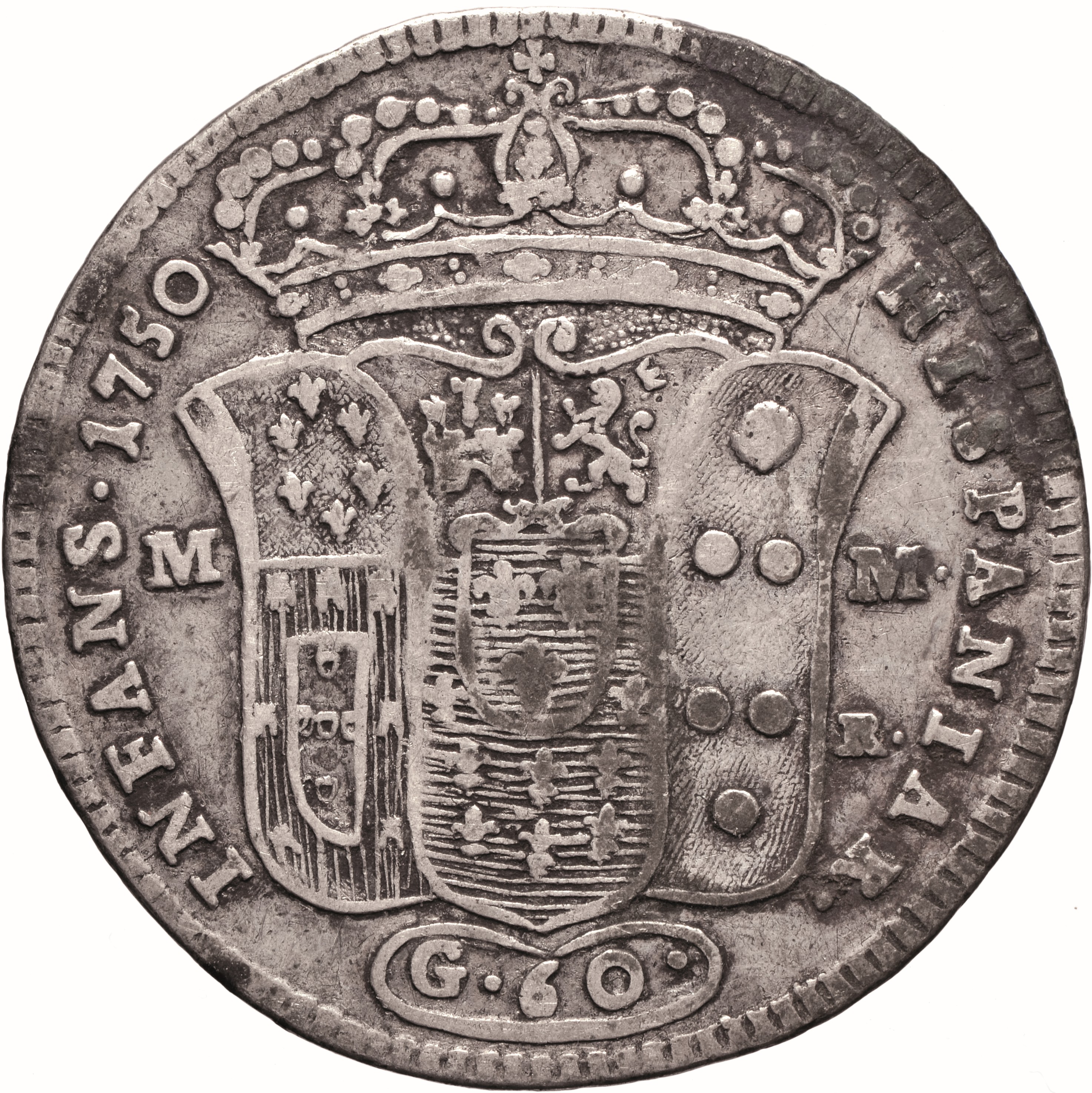 Dritto: Busto del re volto a d., a testa nuda con lunga capigliatura, corazzato e ammantato; sotto, nel campo, De G∙. Campo monetale delimitato da filetto dentellato. Rovescio: Scudo coronato in cartella, interzato in palo: nel 1°, troncato dei Farnese e di Portogallo; nel 2°, troncato: in a), partito di Castiglia e León, in b), di Angiò; nel 3°, dei Medici. Sul tutto, scudetto dei Borbone. Nel campo, ai lati, M∙ / M∙ | R∙; sotto lo scudo, in cartella, G∙ 60·. Campo monetale delimitato da filetto dentellato