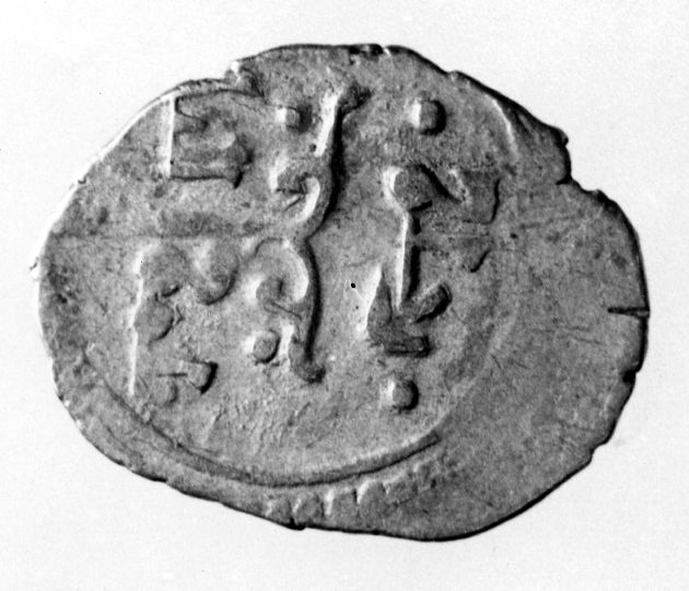 R/ nel campo, asta che al vertice si divide in due branche orizzontali terminanti in arabesco comprendente un globetto; V/ nel campo, iscrizione su tre linee,