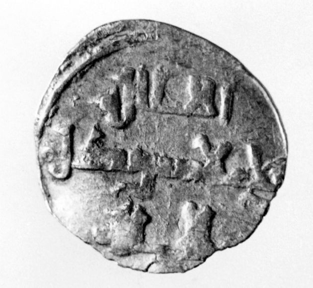R/ nel campo, asta che al vertice si divide in due branche orizzontali terminanti in arabesco, imitando una figura a T; due arabeschi ai lati dell'asta verticale, in basso; V/ nel campo, iscrizione su tre linee,