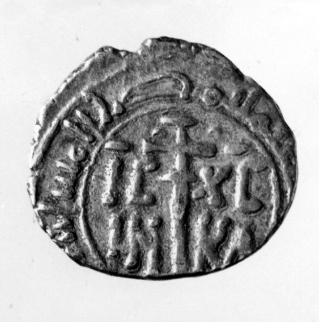R/ nel campo, cerchio con globetto al centro; leggenda nel giro interno ed esterno; V/ nel campo, croce equilatera su asta affiancata dalle sigle IC XC NI KA; il braccio orizzontale è sormontato da due globetti