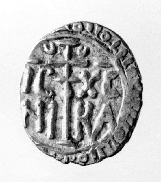 R/ nel campo, cerchio con tre globetti al centro; leggenda nel giro interno ed esterno; V/ nel campo, croce latina con estremi del braccio verticale potenziati su asta culminante in un globetto, affiancata dalle sigle IC XC NI KA,