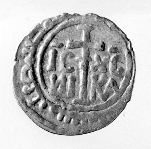R/ nel campo, cerchio ornato di sei globetti con globetto al centro; leggenda nel giro interno ed esterno; V/ nel campo, croce equilatera su asta affiancata dalle sigle IC XC NI KA; nel giro, residuo di leggenda,