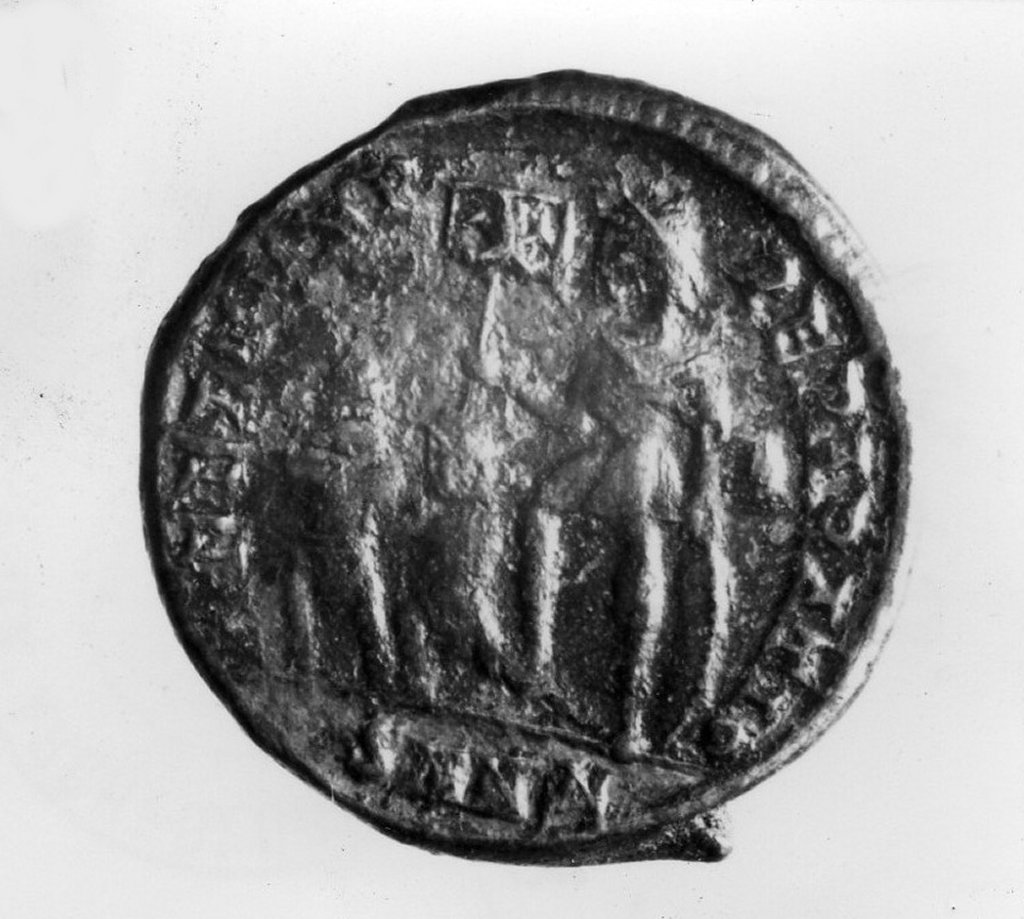 Dritto: Busto di Costanzo II, a s., con drappo, corazza e diadema perlinato; nella d., globo. Rovescio: L'imperatore stante, a s.,in abito militare; nella d.,labarum; con la s. é poggiato sullo scudo; a s.,in campo, due prigionieri inginocchiati con le mani dietro la schiena; in esergo S M N A