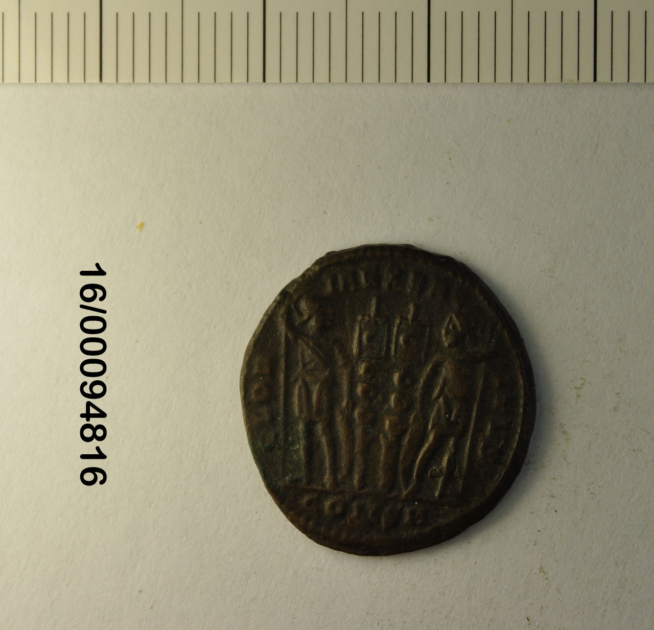 Dritto: Busto drappeggiato con diadema a rosette, di Costantino II a d. Rovescio: Due soldati di fronte che reggono con la mano esterna una lancia e con quella interna uno scudo appoggiato, in mezzo due insegne