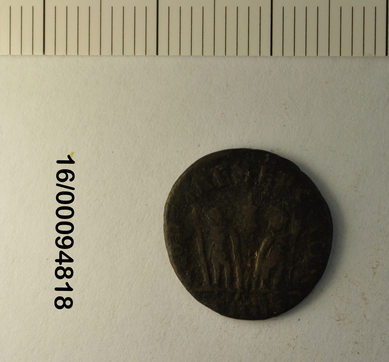Dritto: Busto drappeggiato con diadema a rosette di Costantino II a d. Rovescio: Due soldati di fronte che reggono con la mano esterna una lancia e con quella interna uno scudo appoggiato, in mezzo un'insegna
