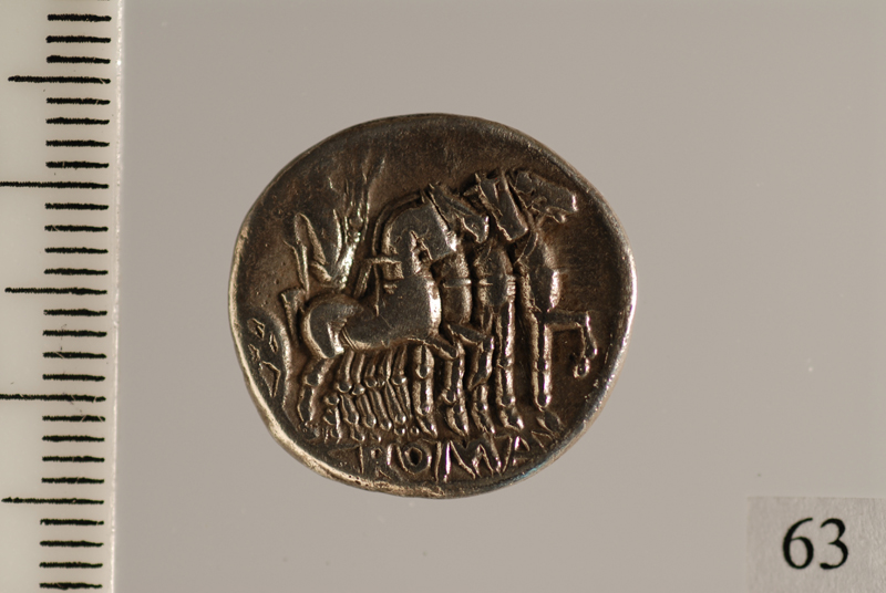 Dritto: Testa galeata di Roma a. d. Rovescio: Giove su quadriga al passo a d., con ramoscello nella mano d., fulmine e redini nella s