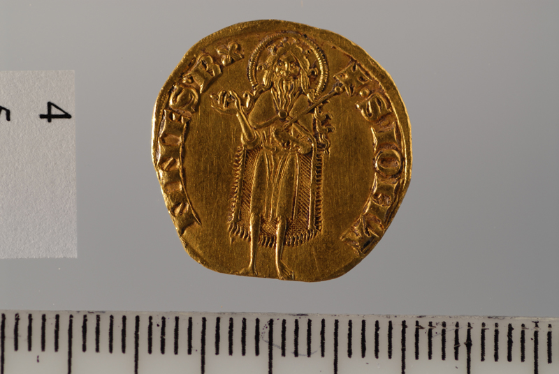 Dritto: Al centro giglio di Firenze con due fiori. Rovescio: San Giovanni di fronte barbato e con nimbo perlato, con tunica di panno liscio e gran mantello allacciato al petto, benedice con la d. e tiene con la s. una lunga croce contro la spalla