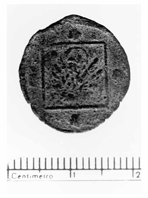 La Beata Vergine nimbata che regge Bambino; leone in soldo, chiuso in qua dro, sopra ogni lato rosetta