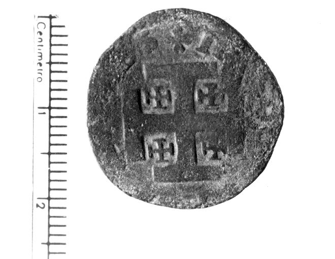 Testa coronata radiata a destra; croce di Gerusalemme,