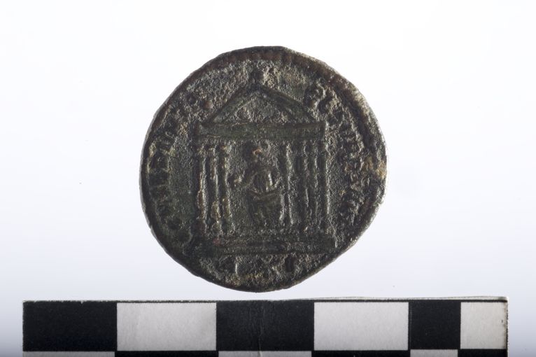 Dritto: Testa laureata di Massimiano Ercole, a d. Rovescio: Tempio a sei colonne; nel mezzo Roma seduta a s., con globo e asta