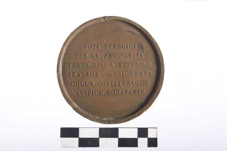Dritto: Scena con figura femminile seduta tra un putto e una figura alata (figure allegoriche) che porge un cartiglio alla figura femminile; lungo il bordo: legenda; in esergo: legenda; sul cartiglio: legenda. Rovescio: legenda