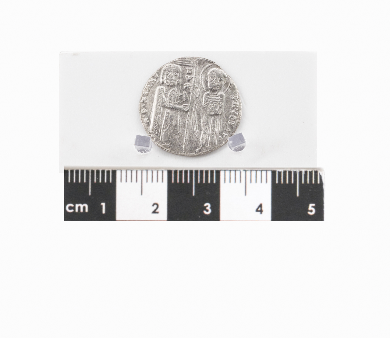 Dritto: Figura stante, paludata (doge) che insieme a San Marco sorregge il vessillo ducale a tre code. Rovescio: Cristo pantocratore seduto in trono sormontato dalla scritta sopralineata IC XC