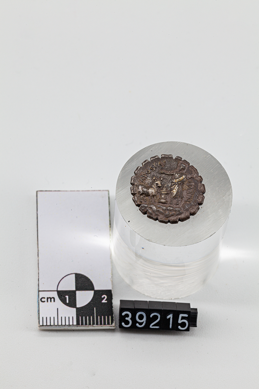 Dritto: Busto di Diana con arco e faretra sulla spalla a d.; sopra, bucranio. Rovescio: Figura togata stante a s. su rupe presso ara accesa, in atto di aspergere con un ramoscello un toro