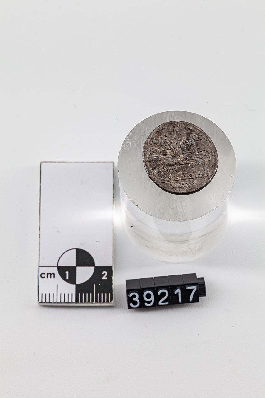 Dritto: Testa di Roma con elmo alato, a d.; dietro, aspex; davanti, *. Rovescio: Marte galeato con asta, scudo e con trofeo in quadriga al galoppo a d