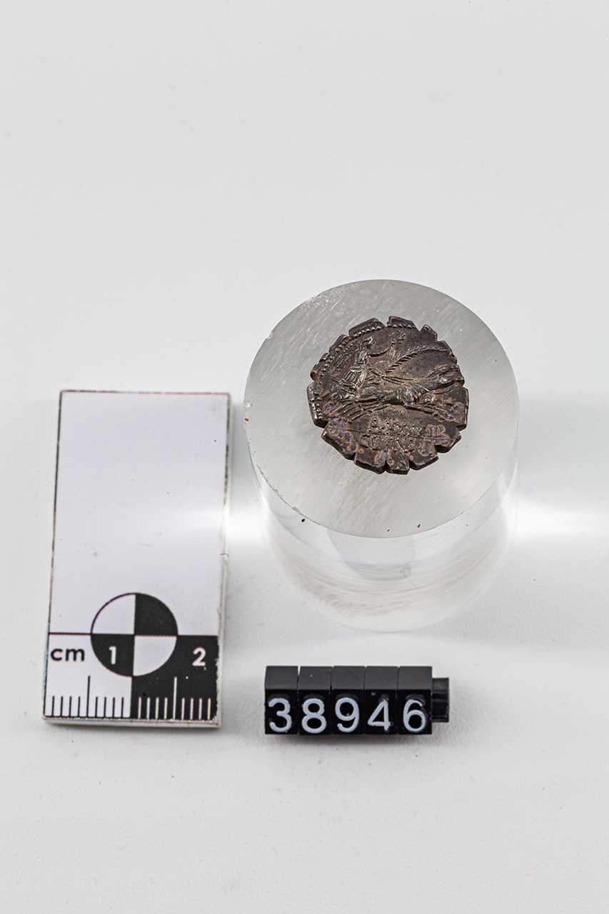 Dritto: Busto di Diana a d., con arco e faretra sulle spalle; davanti, s.C. Rovescio: TI.CLAVD.TI.F/ AP.N Vittoria in biga con palma e corona al galoppo a d.; sotto, A.XXXXIII