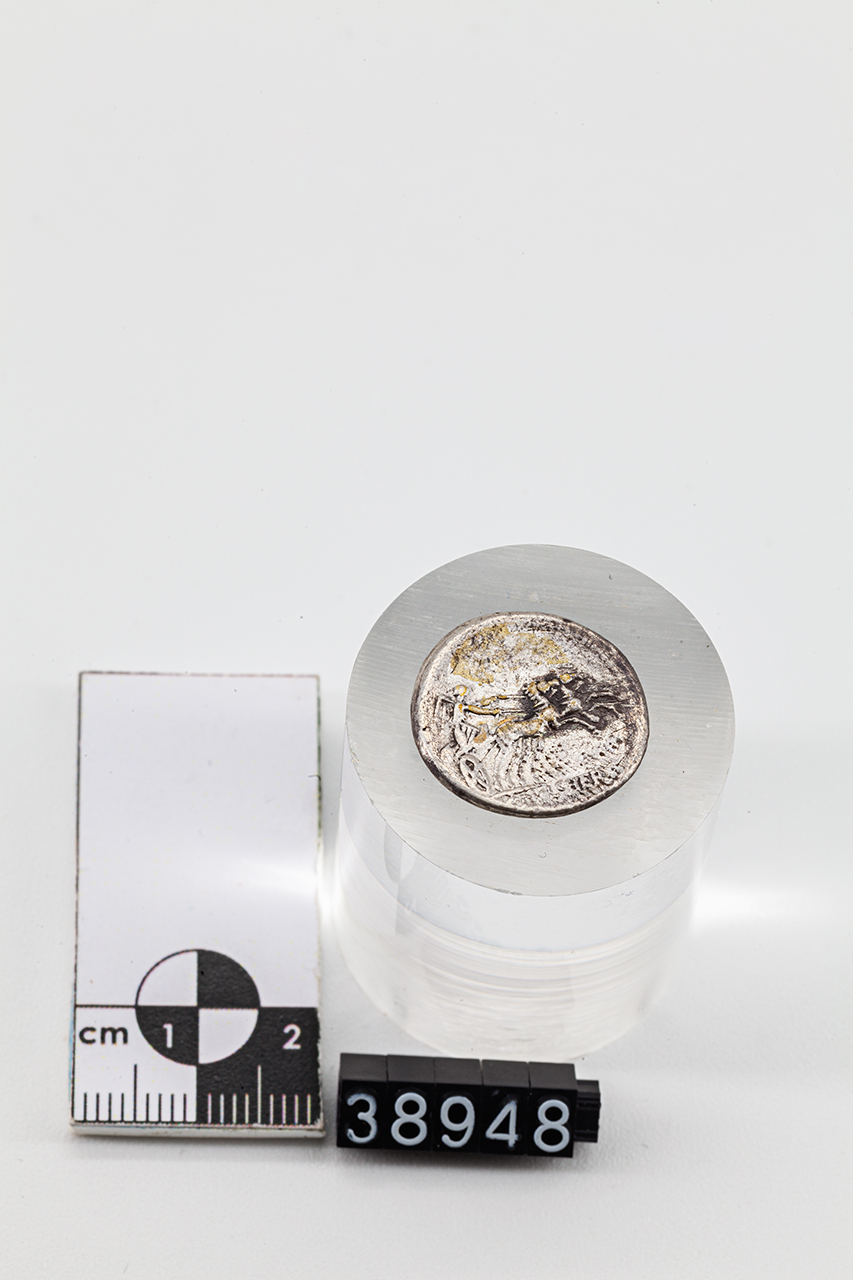 Dritto: Testa di Roma con elmo alato, a d. Rovescio: C.PVLCHER Vittoria in biga al galoppo, a d
