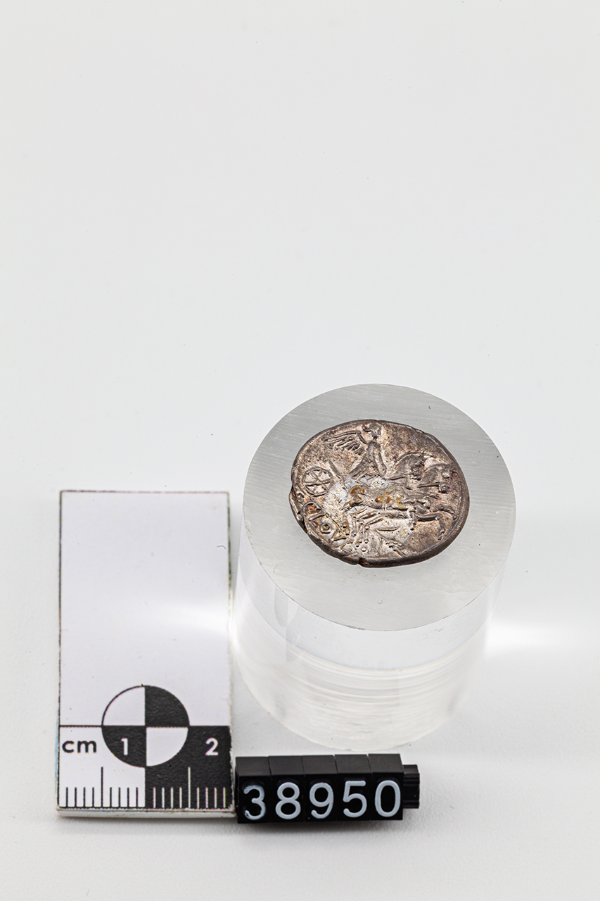 Dritto: Testa di Roma con elmo alato, a d.; sotto, ROMA; dietro, corona. Rovescio: T. CLOVLI Vittoria in biga al galoppo a d.; sotto i cavalli, spiga