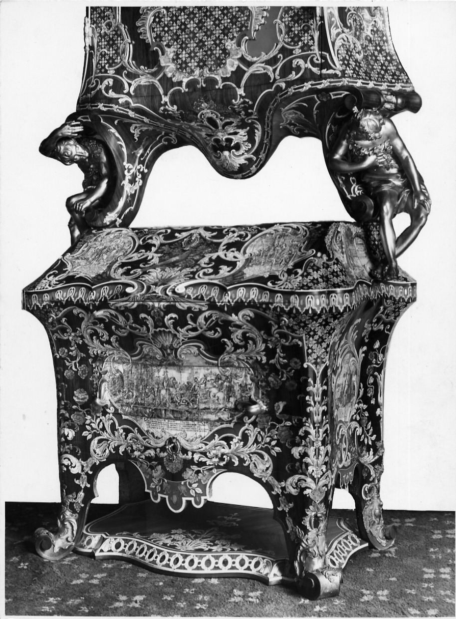 - ISCRIZIONI sul supporto primario: verso - Pietro Piffetti/ Mobile a due corpi, decorato a/ scene figurate e a ornati con/ l'intarsio di legni pregiati, di avorio, di/ madreperla e di tartaruga./ c. 1738/ Particolare/ Roma/ Palazzo del Quirinale - a matita -