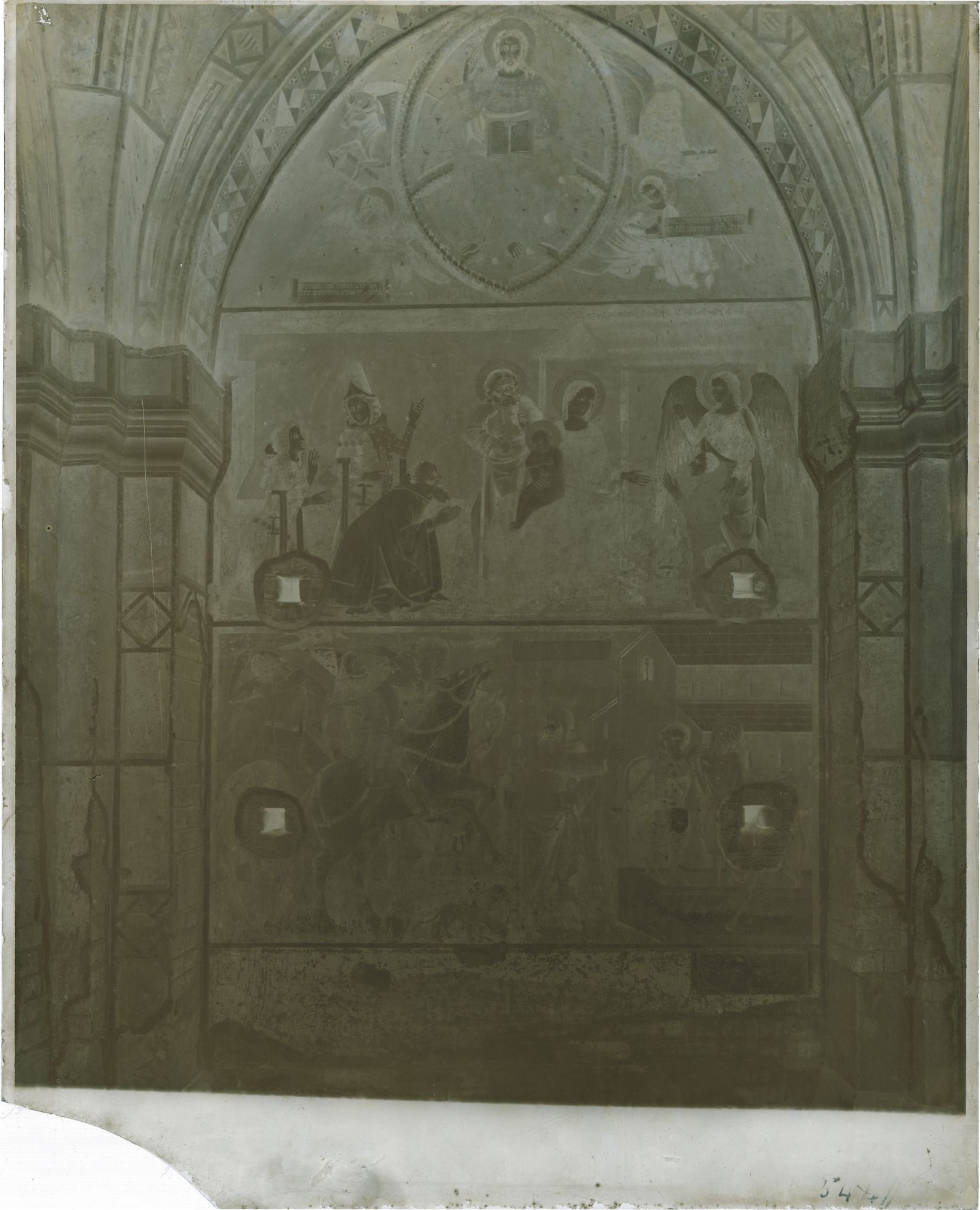 Albugnano (AT) (Vezzolano) - S. Maria di Vezzolano - "Adorazione dei Magi", "Tre cavalieri e i morti" - affreschi AT - Albugnano - Canonica di Santa Maria di Vezzolano: chiostro - braccio settentrionale - seconda campata, parete nord: Maestro di Montiglio, Adorazione dei Magi, leggenda dei tre vivi e dei tre morti, 1355 ca., affresco