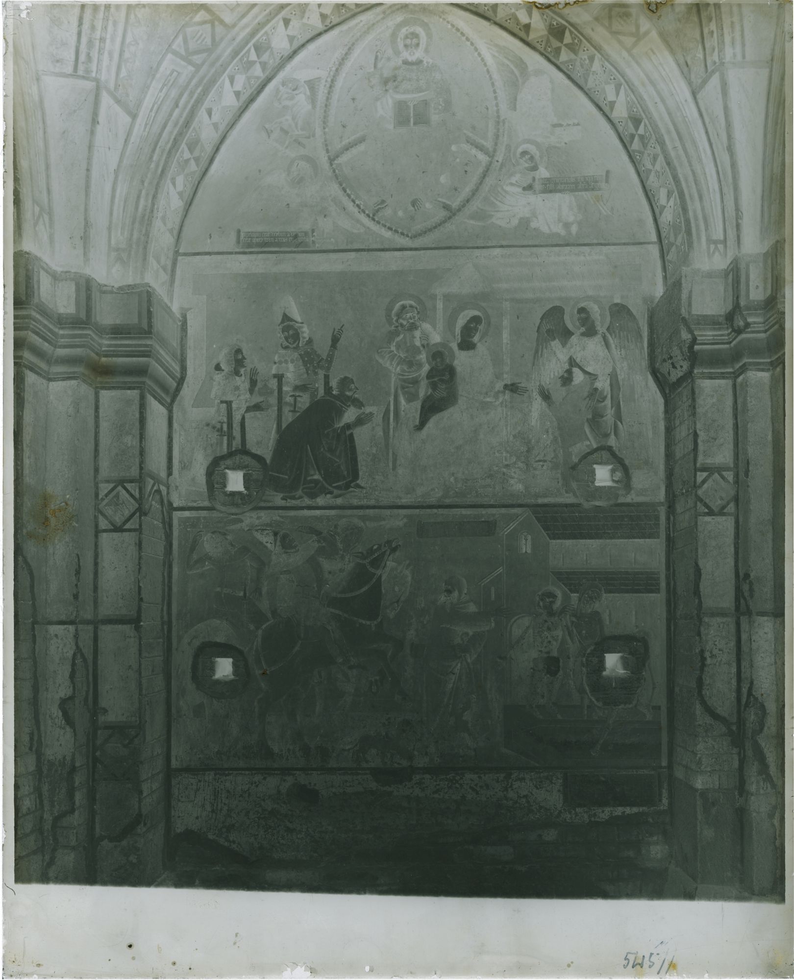 Albugnano (AT) (Vezzolano) - S. Maria di Vezzolano - "Adorazione dei Magi", "Tre cavalieri e i morti" - affreschi AT - Albugnano - Canonica di Santa Maria di Vezzolano: chiostro - braccio settentrionale - seconda campata, parete nord: Maestro di Montiglio, Adorazione dei Magi, leggenda dei tre vivi e dei tre morti, 1355 ca., affresco