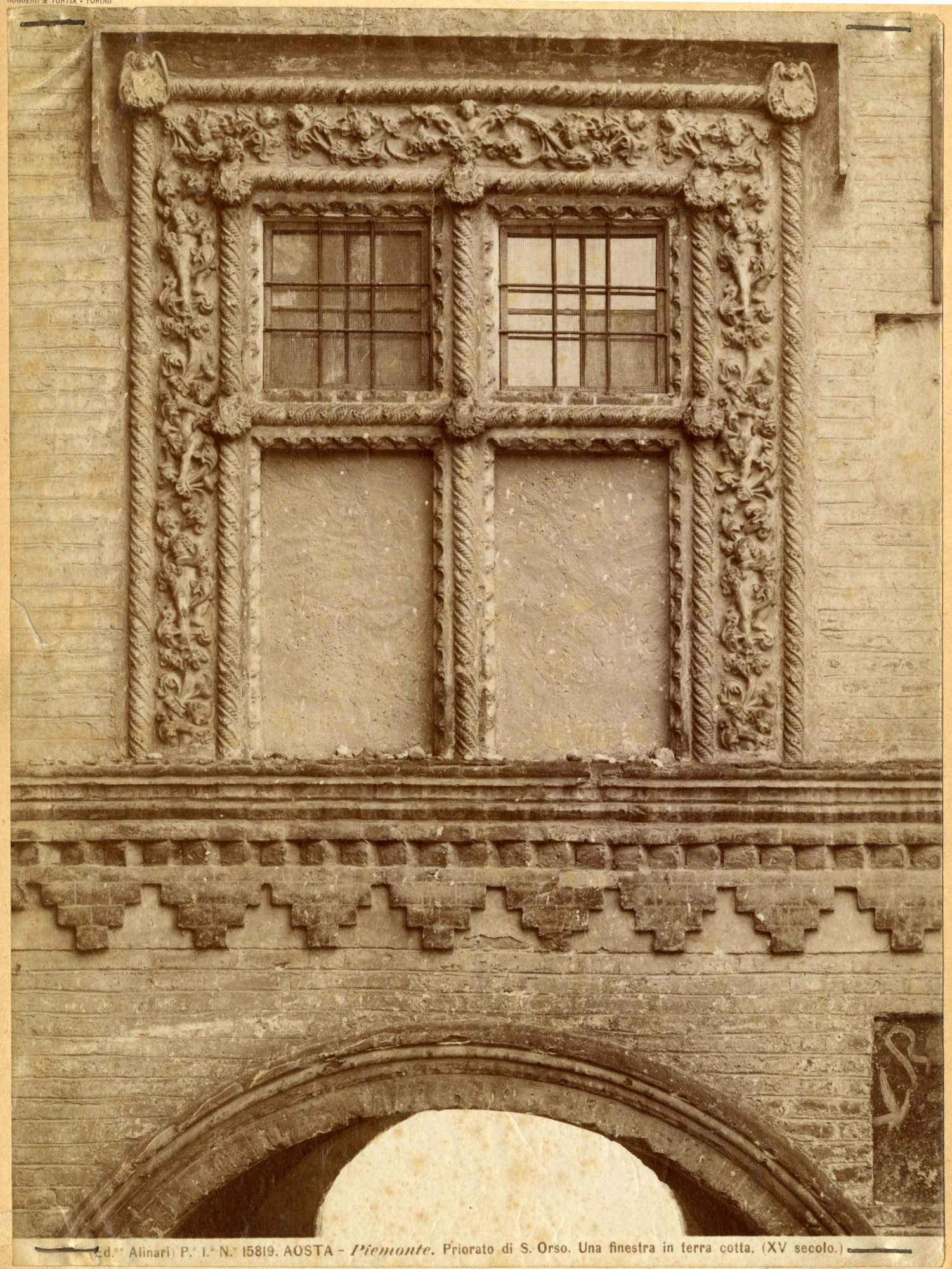 Aosta - Piemonte. Priorato di S. Orso. Una finestra in terra cotta (XV secolo) AO - Aosta - Priorato di Sant'Orso: cortile, lato sud, particolare della finestra crociata di sinistra, prima del restauro