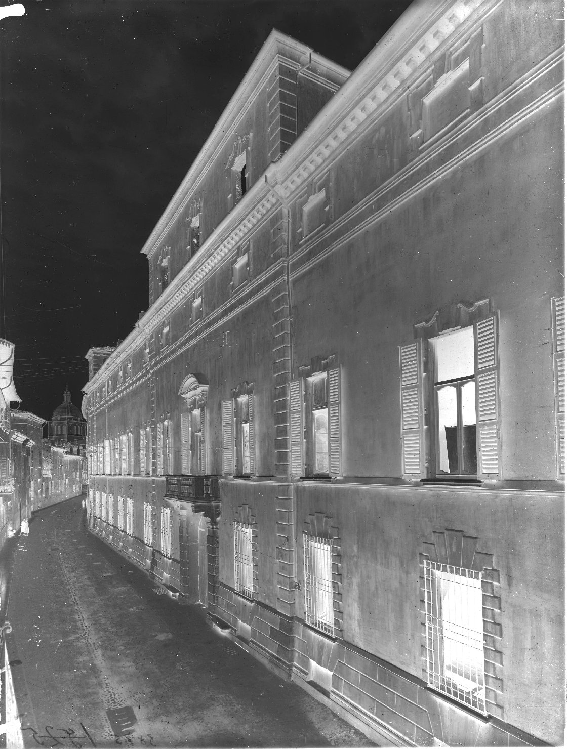 - NOTIZIE STORICO CRITICHE La fotografia fa parte di un piccolo reportage relativo alla "Casa del Fascio", palazzo mantovano del Settecento sito in via Fratelli Bandiera 32, originariamente residenza dei marchesi Ippoliti, poi di proprietà Teni e quindi nel 1932 alienato alla Federazione Provinciale Fascista. Le fotografie oggetto di questa raccolta possono essere ricondotte al passaggio di proprietà dell'edificio, da poco sottoposto a dichiarazione di vincolo, e al risultato dei lavori di adattamento del palazzo a sede del Partito. Nel 1932 Clinio Cottafavi scriveva al soprintendente di Verona di essere stato incaricato "come ispettore onorario ai Monumenti di Mantova, di vigilare appena si inizieranno i lavori di adattamento del fabbricato ... sarei ben lieto di seguire i lavori di demolizione per vedere se venissero in luce importanti cose sotto le attuali soprastrutture per impedirne la distruzione e segnalarle poi a codesta Soprintendenza ..." (SBAP Brescia, Archivio Monumenti, b. 61: Mantova. Edificio via Fratelli Bandiera 32, lettera 18 febbraio 1932). Sempre Cottafavi rassicurava poco dopo che "non solo non si frazionano grandi in piccoli ambienti, ma si abbattono sparsaie per restituire tre saloni alla primitiva grandiosità ... non si porta alcuna modifica alla facciata e non si tocca lo scalone" (IBIDEM, lettera 20 febbraio 1932). I lavori avrebbero portato in luce, sotto il canniccio di un salone, un soffitto ligneo e un fregio ottocentesco ben visibili in una delle fotografie del reportage (NCTN 000) e avrebbero compreso anche un adattamento della facciata (SBAP Brescia, Archivio Monumenti, b. 61, lettera 7 luglio 1932). Sulla base della documentazione, che peraltro si interrompe fino al 1948 -quando il Palazzo era ormai entrato a far parte del Demanio statale- e del riscontro con le immagini, che restituiscono l'aspetto del Palazzo in perfetto stato di ordine e decoro, a restauri ultimati, si propone una datazione agli anni 1932-1933