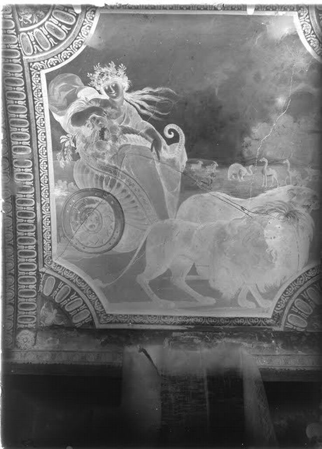 - NOTIZIE STORICO CRITICHE Gli studi preparatori che anticipano l'intervento di restauro sulla Domus Nova presero l'avvio nel 1938, l'anno successivo iniziarono i lavori, diretti dal Sovrintendente di Verona Arturo Barbacci. In questo primo anno fu affrontato il corpo laterale destro e si cominciò il ripristino delle decorazioni, gli interventi furono terminati dall'ing. Raffaello Niccoli nel 1942, dopo il trasferimento di Barbacci a Bologna. Fu un restauro condotto con il rispetto delle forme originali, limitato all'eliminazione di manomissioni e alla ricollocazione degli elementi decorativi. Si lasciò il mattone a vista grezzo senza effettuare l'intonacatura prevista dal progetto originale del Fancelli, reintegrando le cornici della trabeazione, zoccolo e finestre. (vedi A. Barbacci, La Nova Domus nel Palazzo Ducale di Mantova e il suo restauro, in "Le Arti", a. IV, n. 3 (febbraio-marzo), 1942, pp. 222-224). Lo scatto in esame è però da ascriversi ad una fase precedente di restauro che ha interessato la decorazione della Saletta degli Elementi (Vedi Clinio Cottafavi, Gli appartamenti di Eleonora Medici, del Paradiso e dei Nani, Bollettino d'Arte, Serie III, Settembre 1934, pp. 128-139). Le tempere tardo seicentesche furono fissate, pulite e restaurate. Sotto la tempera che raffigura la Terra (a causa del distacco dell'intonaco) fu rinvenuta una testa di frate ad affresco, in seguito staccata e riportata su tela. La porzione mancante fu riprodotta e integrata come dimostra questa immagine a restauro concluso