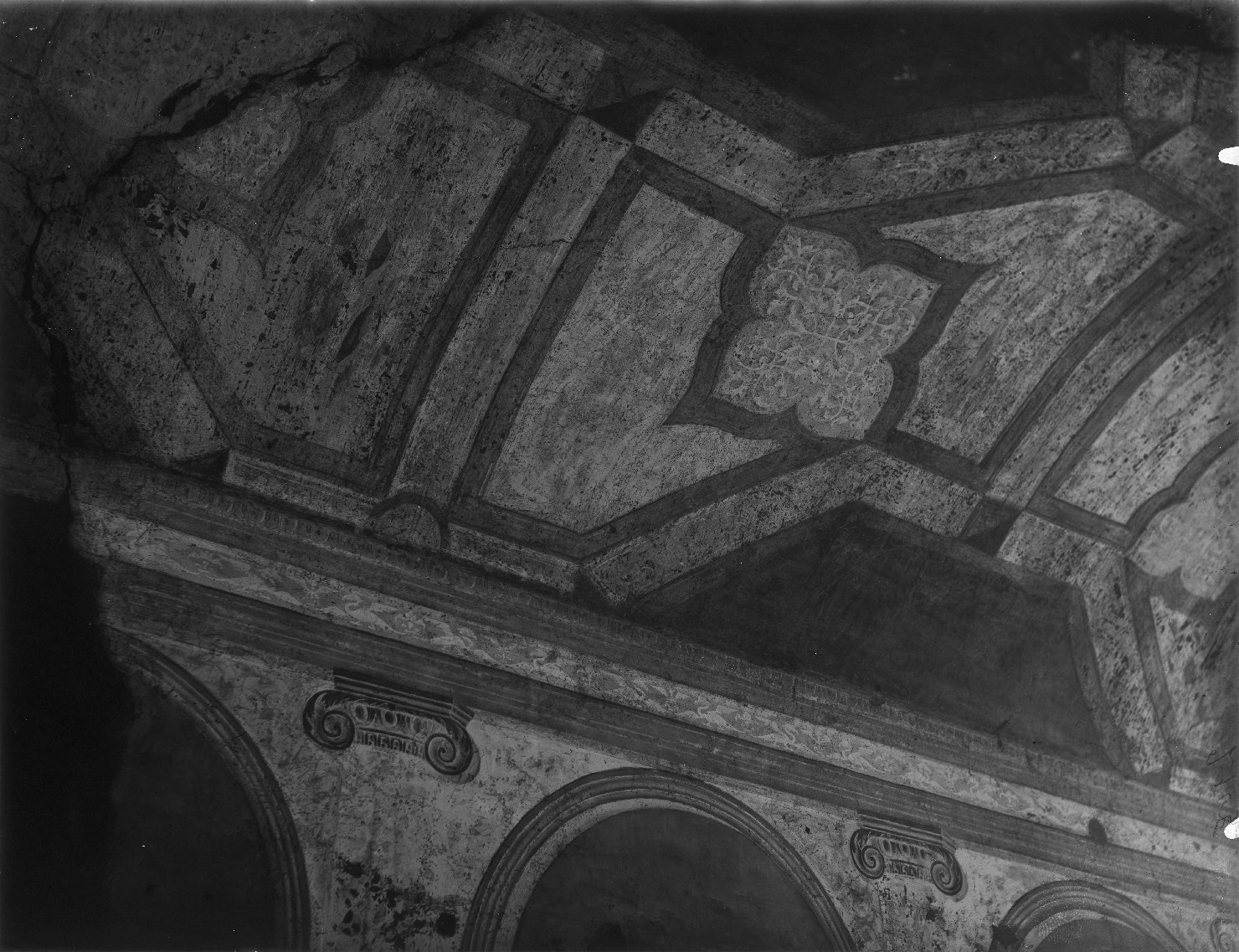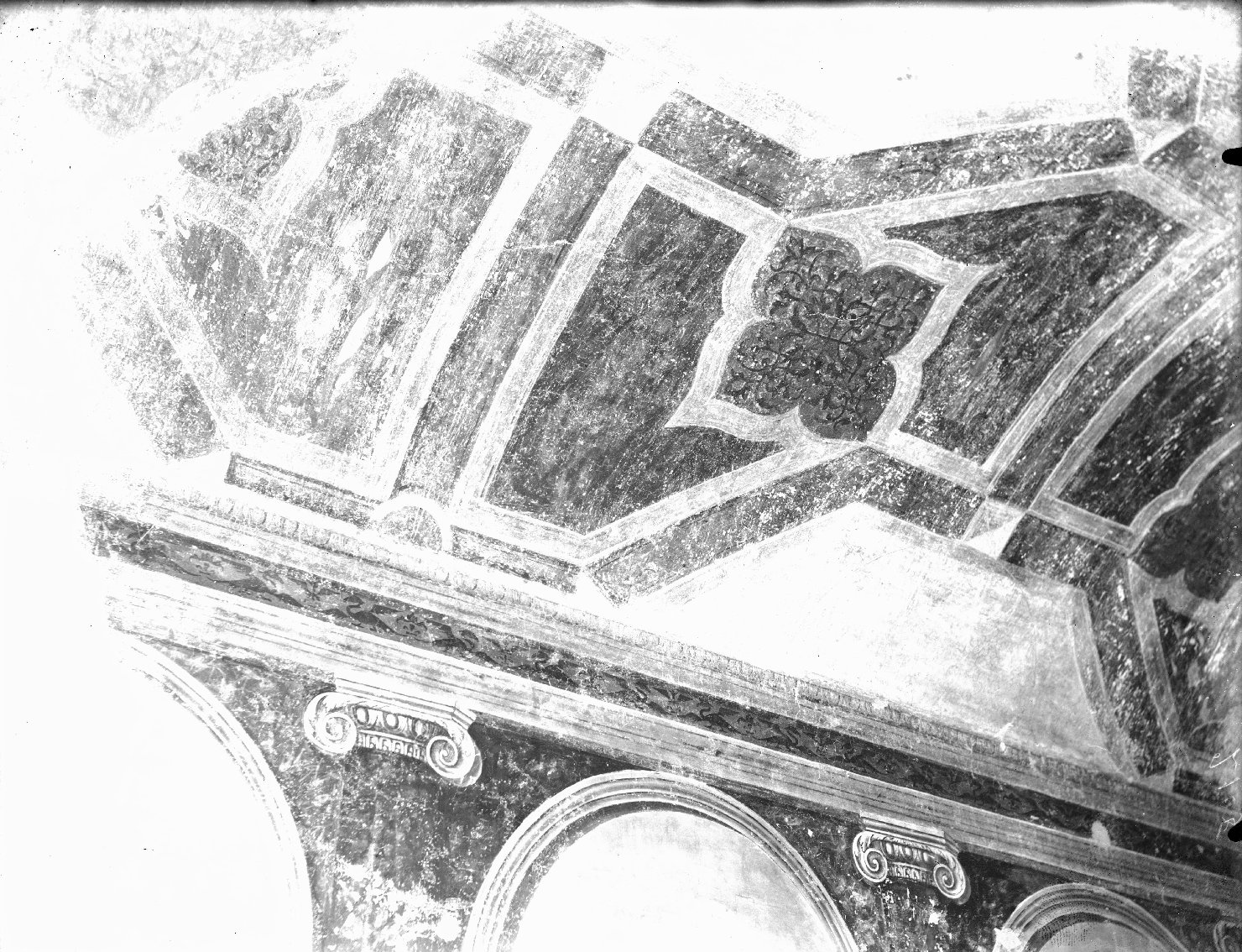 - NOTIZIE STORICO CRITICHE Lo stretto e lungo ambiente, voltato a botte che collegava il cortile del Castello con la torretta di San Giorgio fu decorato presumibilmente nel 1523 da Lorenzo Leonbruno (Leandro Ventura, Lorenzo Leonbruno: un pittore a corte nella Mantova di primo Cinquecento, Roma, Bulzoni, 1995, n. 8, pp. 161-162 e ill. 8a-b). Si tratta dell'«andito che va alla pontesella dereto dal Castello verso Sanzo Zorzo» (così e ricordato nel mandato di pagamento del 1523) ovvero dell'«atrio della torretta di San Giorgio» (come lo definisce Cottafavi). Cottafavi nel 1931 lamentava che in questa parte del pianterreno del Castello non si fossero ancora potuti condurre restauri pittorici e visto l'aspetto delle decorazioni murali fissate dalla lastra, dobbiamo conlcudere che lo scatto sia comunque precedente agli interventi che nel 1931 erano solo auspicati (Clinio Cottafavi, Palazzo Ducale di Mantova. Pian terreno di Castello, "Bollettino d'arte del Ministero della pubblica istruzione", serie II, vol. X, n. 11 (maggio), 1931, pp. 521-527: 526)