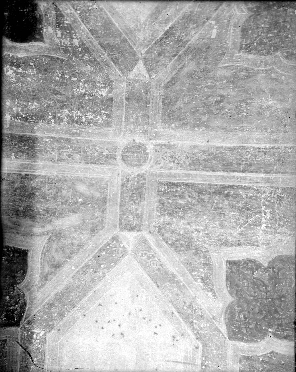 - NOTIZIE STORICO CRITICHE Lo stretto e lungo ambiente, voltato a botte che collegava il cortile del Castello con la torretta di San Giorgio fu decorato presumibilmente nel 1523 da Lorenzo Leonbruno (Leandro Ventura, Lorenzo Leonbruno: un pittore a corte nella Mantova di primo Cinquecento, Roma, Bulzoni, 1995, n. 8, pp. 161-162 e ill. 8a-b). Si tratta dell'«andito che va alla pontesella dereto dal Castello verso Sanzo Zorzo» (così e ricordato nel mandato di pagamento del 1523) ovvero dell'«atrio della torretta di San Giorgio» (come lo definisce Cottafavi). Cottafavi nel 1931 lamentava che in questa parte del pianterreno del Castello non si fossero ancora potuti condurre restauri pittorici e visto l'aspetto delle decorazioni murali fissate dalla lastra, dobbiamo conlcudere che lo scatto sia comunque precedente agli interventi che nel 1931 erano solo auspicati (Clinio Cottafavi, Palazzo Ducale di Mantova. Pian terreno di Castello, "Bollettino d'arte del Ministero della pubblica istruzione", serie II, vol. X, n. 11 (maggio), 1931, pp. 521-527: 526)