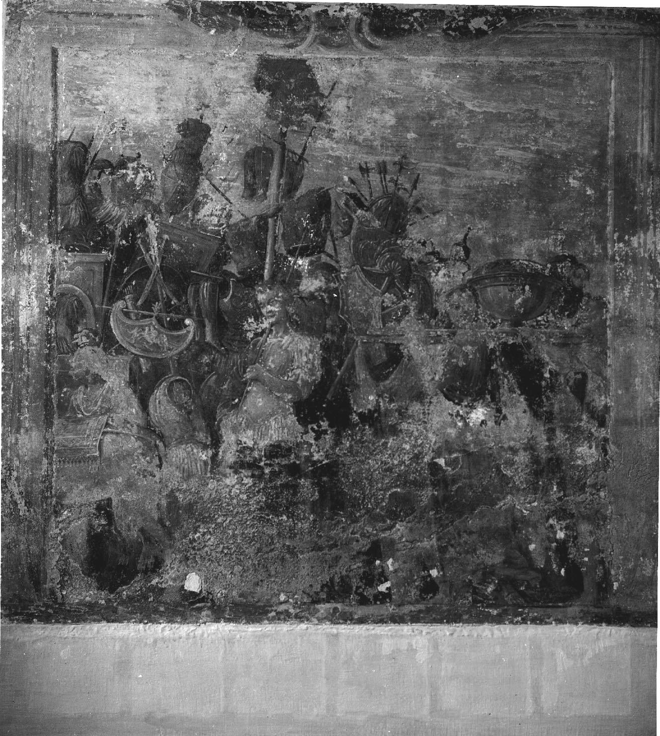 - NOTIZIE STORICO CRITICHE L'opera è una copia seicentesca dei Trionfi di Mantegna, probabilmente i nove riquadri decoravano una sala attigua al salone principale in Palazzo Petrozzani. Tra il 1938 e il 1939 fu realizzato lo strappo e il montaggio su pannelli. Il pessimo stato conservativo del dipinto nella ripresa in esame fa supporre che sia stata eseguita precedentemente o contestualmente allo strappo. L'attribuzione di questi dipinti è assai controversa, la critica concorda invece su una datazione entro il primo quarto del XVII secolo. Rispetto agli originali le copie sono caratterizzate da una tavolozza più povera e di qualità minore. (Vedi S. L'Occaso, Museo di Palazzo Ducale di Mantova. Catalogo generale delle collezioni inventariate, Mantova, 2011, pp. 233-236, fig. 262)