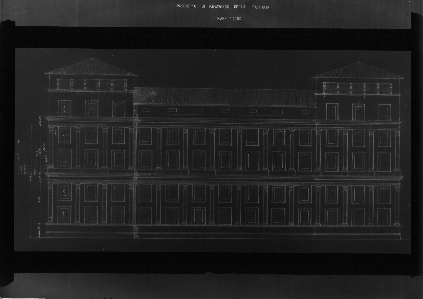 - NOTIZIE STORICO CRITICHE Il progetto di Alfredo Barbacci per il restauro della Domus Nova di Luca Fancelli qui fotografato risulta pubblicato fuori testo a corredo dell'articolo di Nino Giannantoni sulla rivista bimestrale dell'Unione professionisti e artisti di Mantova con la didascalia: «La "Domus Nova" - Progetto di restauro» (La "Nova Domus", "Mantus", a. VI, n. 5 (settembre-ottobre), 1938, pp. 11-13). Dal medesimo testo si deduce l'autografia del disegno, mentre la riquadratura in carta gommata nera che scherma la lastra corrisponde perfettamente al taglio dell'immagine presente sul periodico. Barbacci, ingegnere e Sovrintendente di Verona, curò il progetto approvato nel 1938 dal Consiglio Superiore delle Belle Arti. Giannantoni annuncia l'inizio dei lavori per la primavera del 1939, pur affermando che già sullo scorcio del '38 si andava calando la creta negli stampi per riprodurre gli elementi modulari decorativi con i quali integrare le parti mutile della facciata. La relazione di Barbacci pubblicata su «Le Arti» rende conto dello svolgimento dei lavori protrattisi sino al 1942 (quando fu trasferito a Bologna) sotto la sua direzione e proseguiti poi dall'ingegnere Raffaello Niccoli. (Alfredo Barbacci, La Nova Domus nel Palazzo Ducale di Mantova e il suo restauro, in "Le Arti", a. IV (1942), n. 3 (febbraio-marzo), pp. 222-224). Vale la pena rammentare che un altro disegno preliminare al restauro è testimoniato dalla lastra con inv. 4941