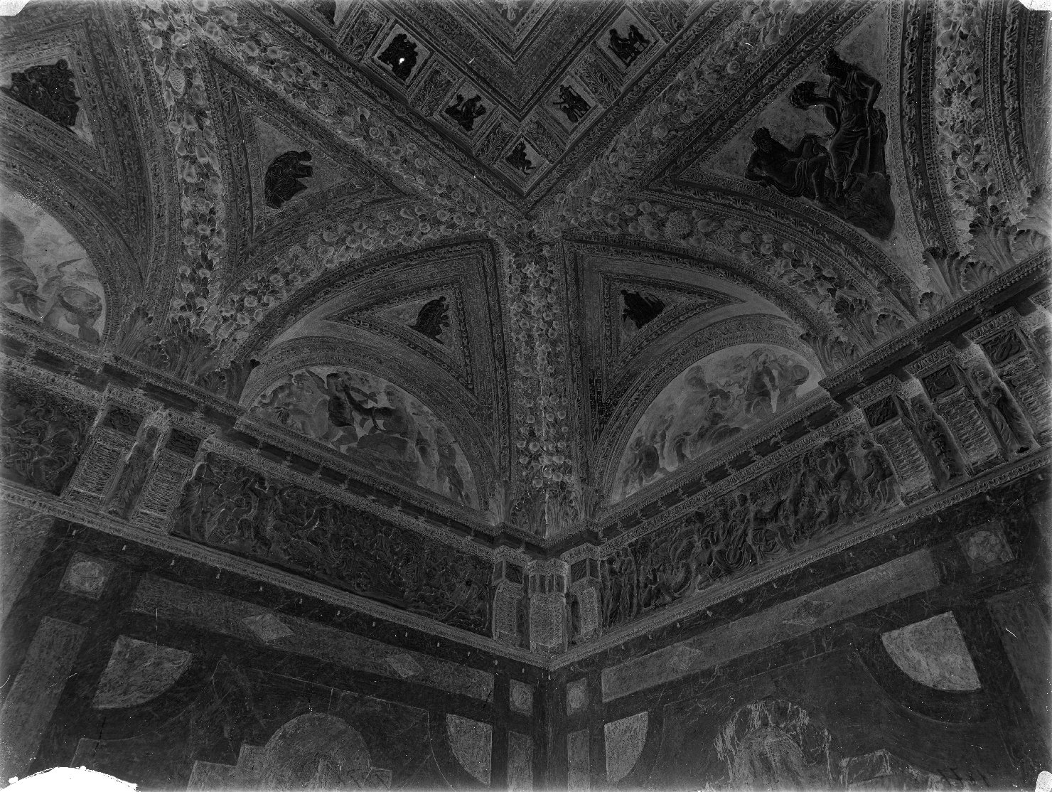- NOTIZIE STORICO CRITICHE La camera delle Virtù appartiene all'Appartamento grande di Castello. Al centro del soffitto stava un' allegoria della musica, ora non più visibile, mentre le Virtù trovavano posto nelle lunette circondate da rilievi policromi in stucco. Al di sotto pannelli con strumenti musicali da collegarsi ai miti di Pan, Bacco e Apollo. Da qui prende il nome l'antica dicitura Sala di Apollo con cui Cottafavi descrive questo ambiente quando relaziona, nel 1931, sui lavori di restauro effettuati. Benché la stanza fosse uscita indenne dall'occupazione militare della prima guerra mondiale, le condizioni complessive erano pessime per i danni causati dalle intemperie sia sulle pitture murali che sugli stucchi in parte crollati. L'operazione di ripristino cercò di evitare ricostruzioni arbitarie intrevenendo solo con saldature e iniezioni di cemento, gesso o scagliola. Il restauro pittorico fu opera di Raffaldini che riuscì a rendere visibili otto delle dodici lunette. Lo scatto in esame documenta lo stato della sala a restauro ultimato e si considera contestuale alla fine dei lavori e alla pubblicazione del contributo di Cottafavi (Clinio Cottafavi, Mantova: palazzo Ducale, Appartamento del Tasso e Sala dei Duchi, in Bollettino d'Arte, Serie III, Agosto 1931, pp. 88-93)