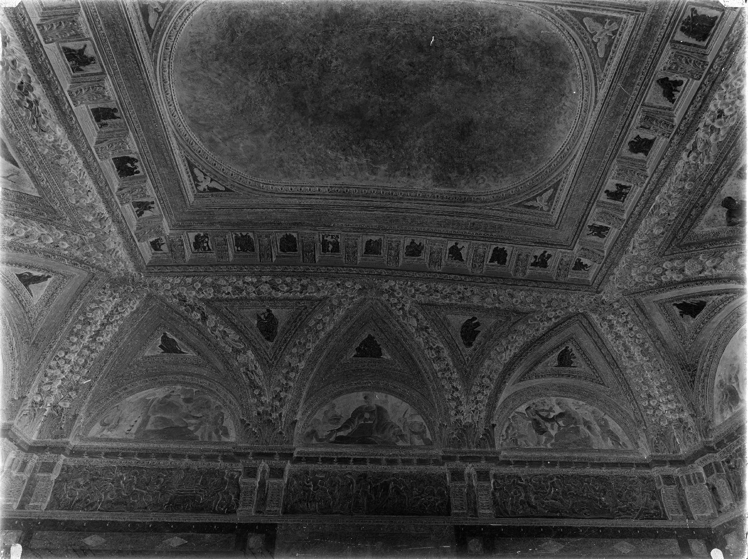 - NOTIZIE STORICO CRITICHE La camera delle Virtù appartiene all'Appartamento grande di Castello. Al centro del soffitto stava un' allegoria della musica, ora non più visibile, mentre le Virtù trovavano posto nelle lunette circondate da rilievi policromi in stucco. Al di sotto pannelli con strumenti musicali da collegarsi ai miti di Pan, Bacco e Apollo. Da qui prende il nome l'antica dicitura Sala di Apollo con cui Cottafavi descrive questo ambiente quando relaziona, nel 1931, sui lavori di restauro effettuati. Benché la stanza fosse uscita indenne dall'occupazione militare della prima guerra mondiale, le condizioni complessive erano pessime per i danni causati dalle intemperie sia sulle pitture murali che sugli stucchi in parte crollati. L'operazione di ripristino cercò di evitare ricostruzioni arbitarie intervenendo solo con saldature e iniezioni di cemento, gesso o scagliola. Il restauro pittorico fu opera di Raffaldini che riuscì a rendere visibili otto delle dodici lunette. Lo scatto in esame documenta lo stato della sala a restauro ultimato ed è pubblicato nel testo di Cottafavi con la didascalia "Sala d'Apollo: lato di levante" (Clinio Cottafavi, Mantova: palazzo Ducale, Appartamento del Tasso e Sala dei Duchi, in Bollettino d'Arte, Serie III, Agosto 1931, pp. 88-93, fig. 3)