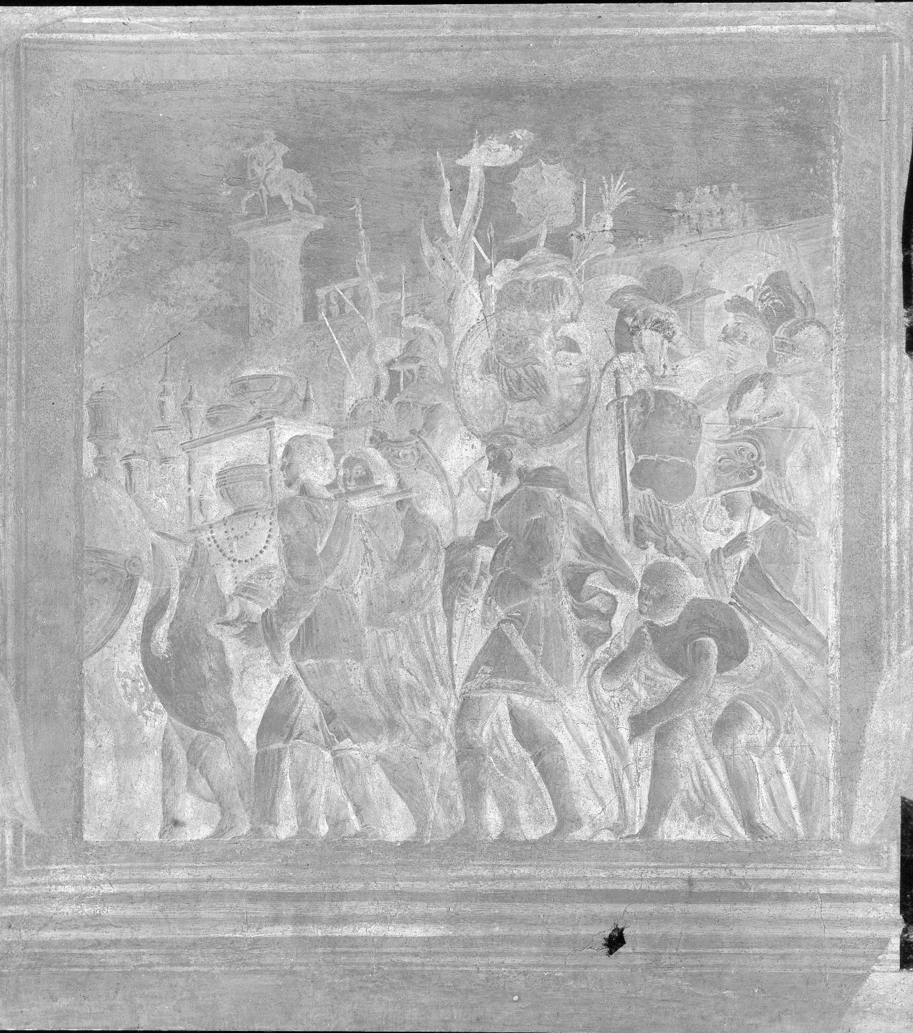 - NOTIZIE STORICO CRITICHE L'opera è una copia seicentesca dei Trionfi di Mantegna, probabilmente i nove riquadri decoravano una sala attigua al salone principale in Palazzo Petrozzani, furono scoperti dallo storico Alessandro Luzio che richiamò l'attenzione degli organi preposti alla tutela e grazie al generoso contributo dell'accademico Prassitele Piccinini tra il 1938 e il 1939 fu realizzato lo strappo e il montaggio su pannelli. Il restauro fu curato da Arturo Raffaldini e Franco Steffanoni (sull'argomento vedi: La copia dei Trionfi mantegneschi in Palazzo Ducale, in Mantus, 1939, n. 1 gennaio-febbraio, pp. 16-17). L'attribuzione di questi dipinti è assai controversa, la critica concorda invece su una datazione entro il primo quarto del XVII secolo. Rispetto agli originali le copie sono caratterizzate da una tavolozza più povera e di qualità minore. (Vedi S. L'Occaso, Museo di Palazzo Ducale di Mantova. Catalogo generale delle collezioni inventariate, Mantova, 2011, pp. 233-236, fig. 261). L'immagine in esame (pubblicata nella citata rivista Mantus, p. 16) mostra la ripresa dell'affresco staccato e montato su pannello, a restauro ultimato. Il pannello è collocato nella Sala dei Fiumi, in Corte Vecchia, come si evince dalla decorazione parietale alle spalle: il trasferimento a Palazzo Ducale si effettuò nei primi mesi del 1939 e i dipinti vennero provvisoriamente collocati presso l'antisala dei Duchi. Dal 2002 si trovano in Palazzo San Sebastiano