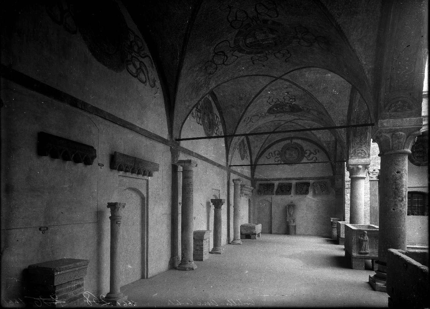 - NOTIZIE STORICO CRITICHE Pubblicata da Cottafavi nel 1931 con la didascalia "Porticato di Bertolino [sic]. Dopo il restauro", la lastra mostra l'aspetto che il porticato settentrionale del Castello di San Giorgio assunse dopo i restauri, conclusisi intorno al 1927 (Clinio Cottafavi, Palazzo Ducale di Mantova. Pian terreno di Castello, "Bollettino d'arte del Ministero della pubblica istruzione", serie II, vol. X, n. 11 (maggio), 1931, pp. 521-528: 524, fig. 4). Le date dello scatto devono quindi essere comprese entro questi due estremi cronologici. Durante i lavori volti al ripristino dei locali posti al pianterreno del Castello (1923-1926) fu ultimato anche il recupero del porticato medievale, prima completamente occluso da sovrastrutture costruite in epoca asburgica. Si notano sul lato sinistro le tre arche medievali facenti parte delle collezioni date in custodia dal Comune allo Stato già nel 1915 e ancor oggi qui collocate, "le colonne e i capitelli raccolti qua e là in città, in occasione di varie demolizioni" cui fa riferimento Giannantoni e altri reperti (Nino Giannantoni, Il Palazzo Ducale di Mantova, Roma, La Libreria dello Stato, 1929, p. 109)