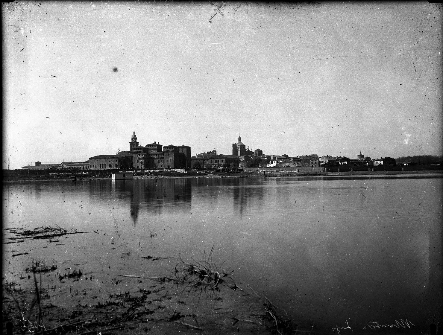 - NOTIZIE STORICO CRITICHE E' possibile circoscrivere cronologicamente la ripresa osservando il ponte di S. Giorgio che risulta già interrato: tra il 1919 e il 1922 fu realizzato l'interramento delle arcate e venne rimosso il ponte levatoio che consentiva il passaggio d'imbarcazioni tra i laghi di Mezzo e Inferiore. Lo scatto è precedente al 1945, anno in cui, nella notte del 24 aprile, il ponte di S. Giorgio fu rovinosamente e irrimediabilmente bombardato