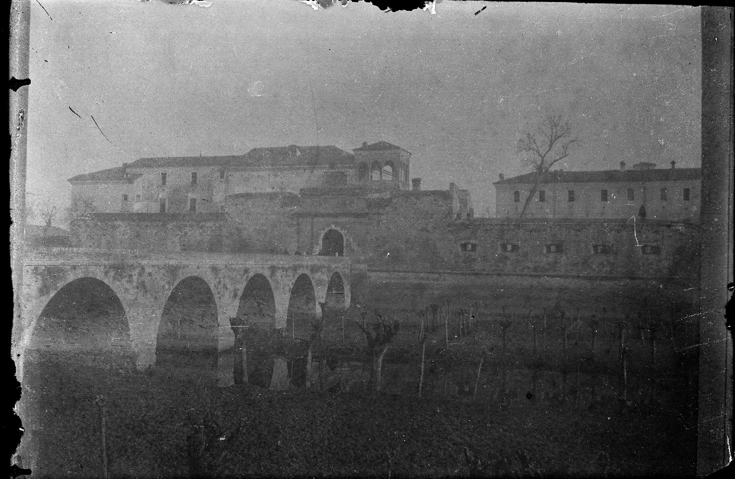- NOTIZIE STORICO CRITICHE A partire dal 1901, in seguito alla volontà di modificare la viabilità urbanistica della città, a Mantova si intraprende un "programma sistematico di demolizione delle porte e delle mura" (Grimoldi 2003). L'immagine in esame raffigura Porta Pusterla ripresa dalla Fossa Magistrale (residuo del Lago Paiolo, prosciugato già nel Settecento ma la cui bonifica fu completata solo nel 1905). La Porta con relativa torre venne abbattuta nel 1903. L'albumina originale, da cui è tratto il negativo di riproduzione in esame, è reperibile sul sito Lombardia Beni Culturali (attribuzione allo Studio Calzolari). La qualità della riproduzione è molto scarsa e poco leggibile