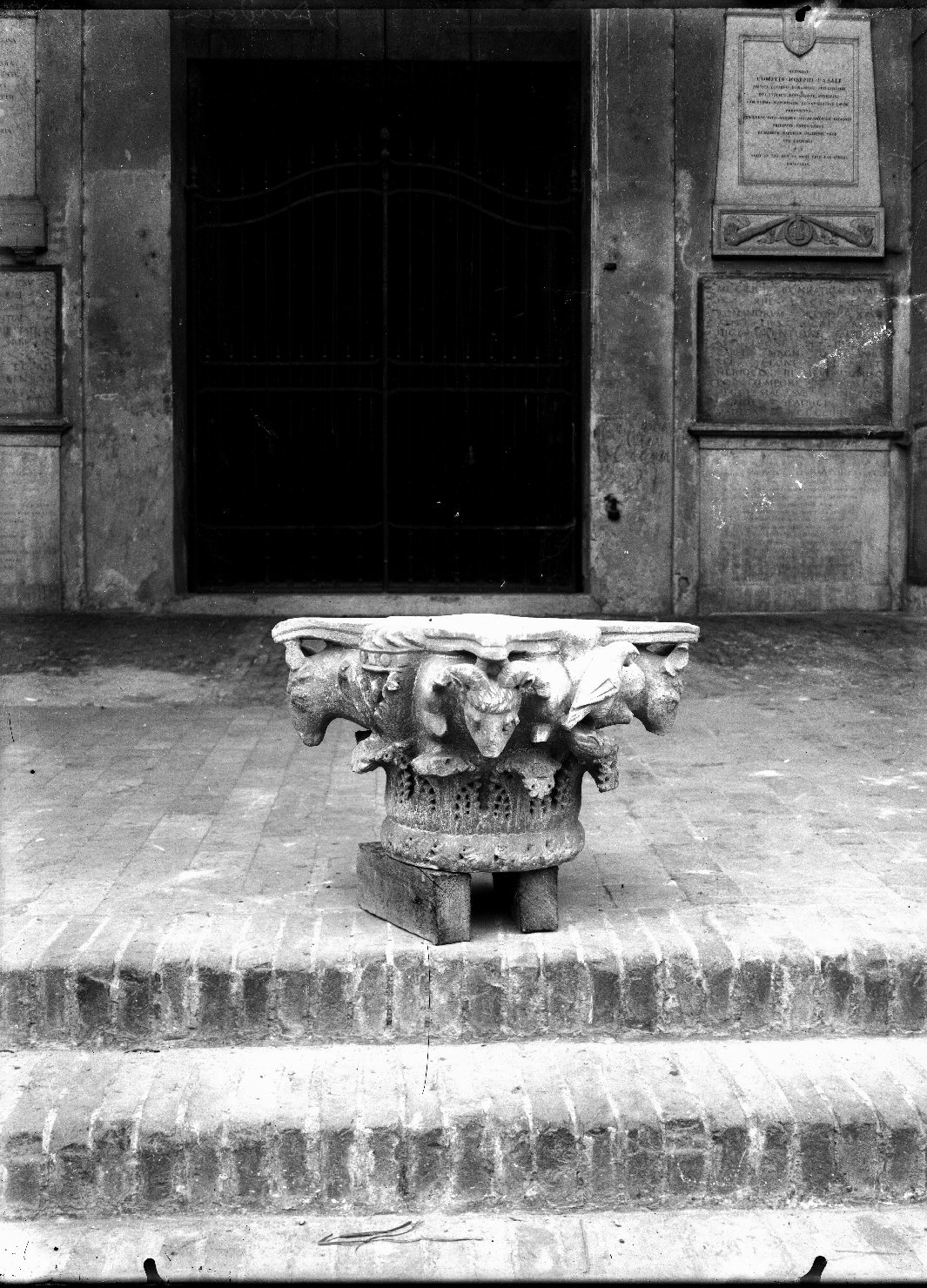 - NOTIZIE STORICO CRITICHE Questa serie di scatti documenta reperti architettonici (in massima parte lo stesso capitello zoomorfo e alcune lastre a rilievo), posti esternamente sulla scalinata del pronao settentrionale. Dall'analisi morfologica del negativo si può circoscrivere un arco cronologico tra gli anni '20 e gli anni '40 del Novecento. Probabilmente si tratta dei capitelli provenienti dalla facciata della Basilica, in pietra gallina, che coronavano le lesene dell’arco trionfale del nartece, attribuite a Luca Fancelli, ora conservati presso il Museo della Città in Palazzo S. Sebastiano, a Mantova, nella sezione "la città del principe"