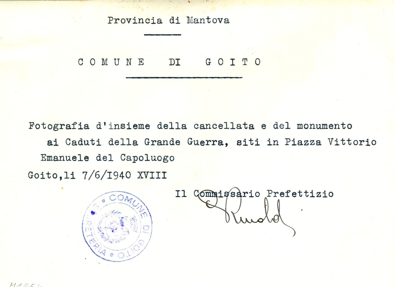 - NOTIZIE STORICO CRITICHE La fotografia è stata inviata in data 7 giugno 1940, dal Comune di Goito alla Regia Soprintendenza ai Monumenti di Verona, in seguito alla richiesta relativa al censimento di cancellate metalliche di proprietà pubblica da destinare allo stato per esigenze belliche. Nel documento che accompagna le fotografie si richiede l’esenzione dall’obbligo di consegna di due recinzioni: quello del Monumento al Bersagliere e quello ai Caduti della Grande Guerra, mentre si considerano asportabili quelle delle varie scuole elementari poste sul territorio comunale. La Sovrintendenza chiede espressamente due stampe fotografiche per ogni monumento, con veduta d’insieme e dettaglio della decorazione, e dopo averle valutate senza rilevare nei manufatti gli elementi di pregio richiesti dalle disposizioni ministeriali, ne disporrà la rimozione e la fusione. Anche il monumento subirà la stessa sorte e la statua in bronzo con allegoria della Patria benedicente, opera dello scultore Giuseppe Menozzi, verrà sacrificata nel 1943 per scopi bellici. Confrontando le immagini storiche con lo stato attuale si rileva che dell’intera struttura, progettata dall’architetto Ettore Martini, con pilastro polilobato in marmo, resta solo l’ossatura portante