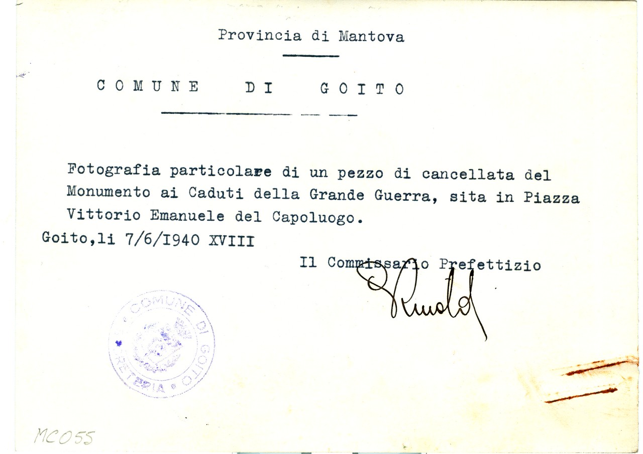 - NOTIZIE STORICO CRITICHE La fotografia è stata inviata in data 7 giugno 1940, dal Comune di Goito alla Regia Soprintendenza ai Monumenti di Verona, in seguito alla richiesta relativa al censimento di cancellate metalliche di proprietà pubblica da destinare allo stato per esigenze belliche. Nel documento che accompagna le fotografie si richiede l’esenzione dall’obbligo di consegna di due recinzioni: quello del Monumento al Bersagliere e quello ai Caduti della Grande Guerra, mentre si considerano asportabili quelle delle varie scuole elementari poste sul territorio comunale. La Soprintendenza chiede espressamente due stampe fotografiche per ogni monumento, con veduta d’insieme e dettaglio della decorazione, e dopo averle valutate senza rilevare nei manufatti gli elementi di pregio richiesti dalle disposizioni ministeriali, ne disporrà la rimozione e la fusione