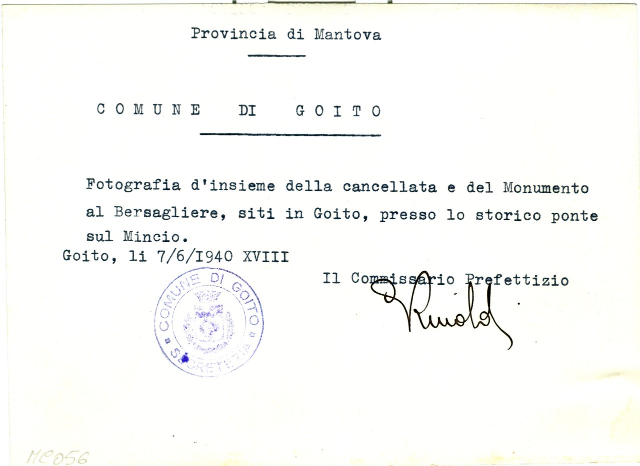 - NOTIZIE STORICO CRITICHE La fotografia è stata inviata in data 7 giugno 1940, dal Comune di Goito alla Regia Soprintendenza ai Monumenti di Verona, in seguito alla richiesta relativa al censimento di cancellate metalliche di proprietà pubblica da destinare allo stato per esigenze belliche. Nel documento che accompagna le fotografie si richiede l’esenzione dall’obbligo di consegna di due recinzioni: quello del Monumento ai Caduti della Grande Guerra e quella del Monumento al Bersagliere realizzato nel 1926 dallo scultore torinese Giorgio Ceragioli su iniziativa della Sezione bersaglieri di Mantova. Si considerano invece asportabili le recinzioni delle varie scuole elementari poste sul territorio comunale. La Sovrintendenza chiede espressamente due stampe fotografiche per ogni monumento, con veduta d’insieme e dettaglio della decorazione, e dopo averle valutate senza rilevare nei manufatti gli elementi di pregio richiesti dalle disposizioni ministeriali, ne disporrà la rimozione e la fusione