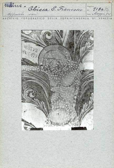 - ISCRIZIONI sul supporto secondario: in alto - Udine -/ Chiesa S. Francesco/ Affreschi vari/ ARCHIVIO FOTOGRAFICO DELLA SOPRINTENDENZA DI VENEZIA/ Negativo/ N° 7184/ Data Maggio 943 - Archivio Fotografico Soprintendenza ai Monumenti di Venezia - a penna/ a stampa - italiano