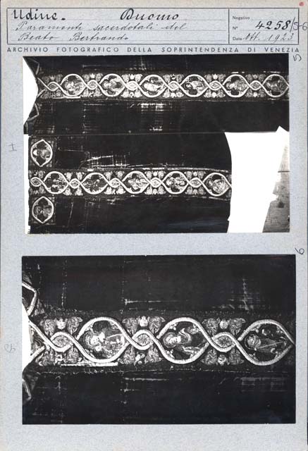 - ISCRIZIONI sul supporto secondario: in alto - Udine - Duomo/ Paramenti sacerdotali del/ Beato Bertrando/ ARCHIVIO FOTOGRAFICO DELLA SOPRINTENDENZA DI VENEZIA/ Negativo/ N° 4258/ Data Ott. 1923 - Archivio Fotografico Soprintendenza ai Monumenti di Venezia - a penna/ a stampa - italiano