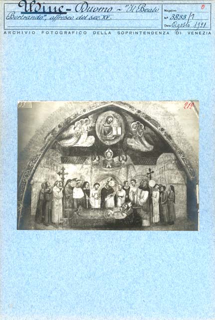 - ISCRIZIONI sul supporto secondario: in alto - Udine - Duomo - "Il Beato/ Bertrando", affresco del sec. XV/ ARCHIVIO FOTOGRAFICO DELLA SOPRINTENDENZA DI VENEZIA/ Negativo/ N° 3833/ Data Agosto 1921 - Archivio Fotografico Soprintendenza ai Monumenti di Venezia - a penna/ a stampa - italiano