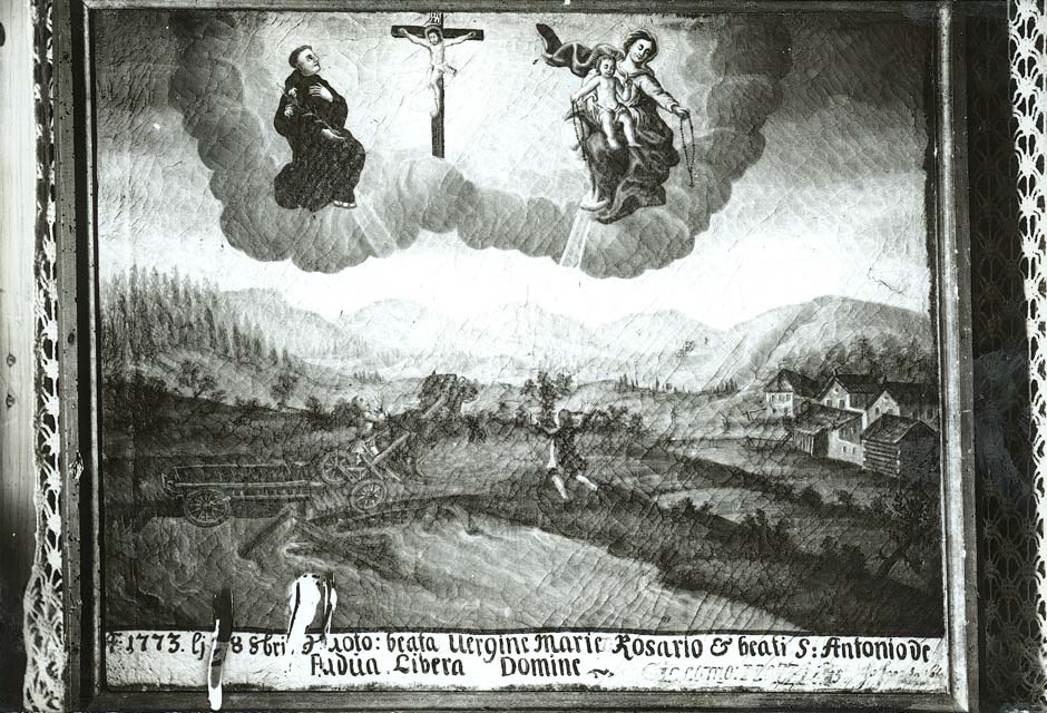 - ISCRIZIONI sul supporto secondario: in alto - C. Comeglians - (Udine/ Chiesa S. Giorgio/ Ex voto tavola del 1773 con la/ ARCHIVIO FOTOGRAFICO DELLA SOPRINTENDENZA DI VENEZIA/ Negativo/ N° 4305/ Data Sett. 1923 - Archivio Fotografico Soprintendenza ai Monumenti di Venezia - a penna/ a stampa - italiano