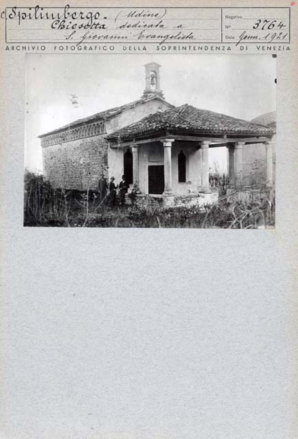 - ISCRIZIONI sul supporto secondario: in alto - C. Spilimbergo - (Udine)/ Chiesetta dedicata a/ S. Giovanni Evangelista/ ARCHIVIO FOTOGRAFICO DELLA SOPRINTENDENZA DI VENEZIA/ Negativo/ N° 3764/ Data Genn. 1921 - Archivio Fotografico Soprintendenza ai Monumenti di Venezia - a penna/ a stampa - italiano