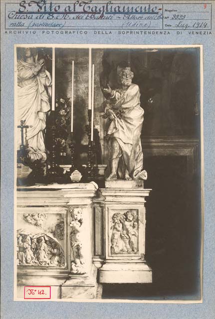 - ISCRIZIONI sul supporto secondario: in alto - S. Vito al Tagliamento -/ Chiesa di S. Maria dei Battuti- Altare del Ba-/-ratta. (particolare) (Udine)/ ARCHIVIO FOTOGRAFICO DELLA SOPRINTENDENZA DI VENEZIA/ Negativo/ N° 3323/ Data Lug. 1914 - Archivio Fotografico Soprintendenza ai Monumenti di Venezia - a penna/ a stampa - italiano