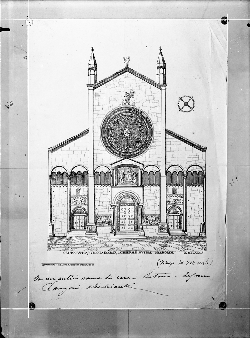 - NOTIZIE STORICO CRITICHE Nel 1859, l’arciprete maggiore del Duomo di Modena Don Pietro Cavedoni, pubblicò un libretto “Sventure del Duomo di Modena”, che rappresentava il punto d’arrivo della sua lunga riflessione sulla Cattedrale modenese e il frutto delle sue ricerche nell’Archivio Capitolare. Il Cavedoni trovò che nel 1762, nella nicchia sopra la porta centrale della facciata del Duomo, era stato collocato il sarcofago del vescovo di Modena Ferrari, ma anche che “quel tempietto […] è luogo tanto cospicuo e venerando che chiama, non per sola convenienza, ma per vera necessità una o più statue in onore di Dio, o della Vergine, o di San Geminiano”. A conferma dell’esistenza di un’immagine del Santo patrono in quell’edicola, il Cavedoni ricorda l’incisione della facciata del Duomo realizzata da Bartolomeo Fenis, inserita nella pubblicazione di Lodovico Vedriani “Vita del glorioso San Geminiano” del 1663. L’acquaforte di Fenis citata da Cavedoni, inclusa nel primo capitolo di Acidini Luchinat in “I restauri del Duomo di Modena 1875-1984” (p. 23, vedi BIB), è il soggetto della lastra in esame. Il negativo è la fotografia di una riproduzione del disegno originale di Fenis, realizzata dalla Tipografia Immacolata Concezione di Modena nel 1892. Sulla stampa è manoscritto (ma in alcune parti difficilmente decifrabile) “Da un antico ramo di casa. Lotario depone [?] Rangoni Macchiavelli’. Lotario Rangoni Macchivelli (1913-1942) era un marchese di origine modenese (dalla famiglia Rangoni) e fiorentina (dalla famiglia Machiavelli) ma anche un famoso pilota automobilistico e aviatore italiano. Si ipotizza che la stampa sia stata prestata o ceduta alla Soprintendenza ai Monumenti dell'Emilia, dal marchese Rangoni Macchiavelli prima della sua morte avvenuta nel 1942 in un incidente durante un test automobilistico. Come desunto dalle iscrizioni sul pergamino, il fototipo è stato realizzato dal personale interno alla Soprintendenza. Si decide però di indicare come anonimo autore, l'esecutore della lastra in disamina. Per confronto con le matrici N_002058 e N_002059 che riportano la stessa modalità di riquadro intorno al disegno del Duomo, si sceglie di indicare come arco cronologico della ripresa gli anni compresi tra il 1930 e il 1950