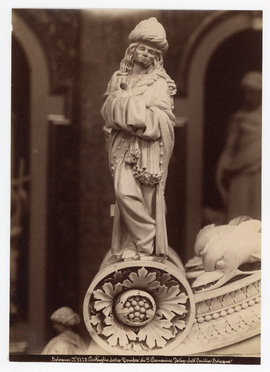 - NOTIZIE STORICO CRITICHE Il negativo 3320 della presente stampa, conservato presso le collezioni Genus Bononiae della Fondazione Cassa di Risparmio in Bologna, fu realizzato dal fotografo centese Pietro Poppi (1833-1914), titolare della ditta Fotografia dell'Emilia; secondo quanto indicato nella scheda della lastra alla gelatina, la ripresa fu eseguita tra il 1883 ed il 1888 (https://collezioni.genusbononiae.it/products/dettaglio/13315). La realizzazione del positivo è da collocarsi invece dopo il 1891, anno di istituzione dell'Ufficio regionale per la conservazione dei Monumenti dell'Emilia (primo ente costitutore dell'archivio fotografico, ufficio da cui nascerà la Soprintendenza ai Monumenti di Bologna) e il 1910 circa per via della tecnica di stampa all'albume (dal 1907 la ditta era già di proprietà dei successori di Poppi, vedi Osservazioni). Si segnala che la fascetta didascalica attualmente presente sulla lastra è più recente rispetto a quella sul positivo in esame, forse originaria. L'arca di San Domenico, vero e proprio palinsesto scultoreo realizzato tra il XIII e XVIII secolo, ha avuto una lunga storia di cambiamenti e aggiunte. Il sarcofago duecentesco, lavorato a rilievo da Nicola Pisano e aiuti (Arnolfo di Cambio e il converso domenicano Guglielmo da Pisa) e originariamente poggiato su colonnine, venne arricchito nel secondo Quattrocento dalla cimasa di Niccolò dell'Arca (con piccoli interventi del giovane Buonarroti); e ancora nel 1532 Alfonso Lombardi elaborò la stele istoriata sulla quale poggia il sarcofago. Infine Jean-Baptiste Boudard nel 1768 eseguì il paliotto scultoreo dell'altare su cui è stata collocata l'intera arca